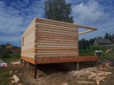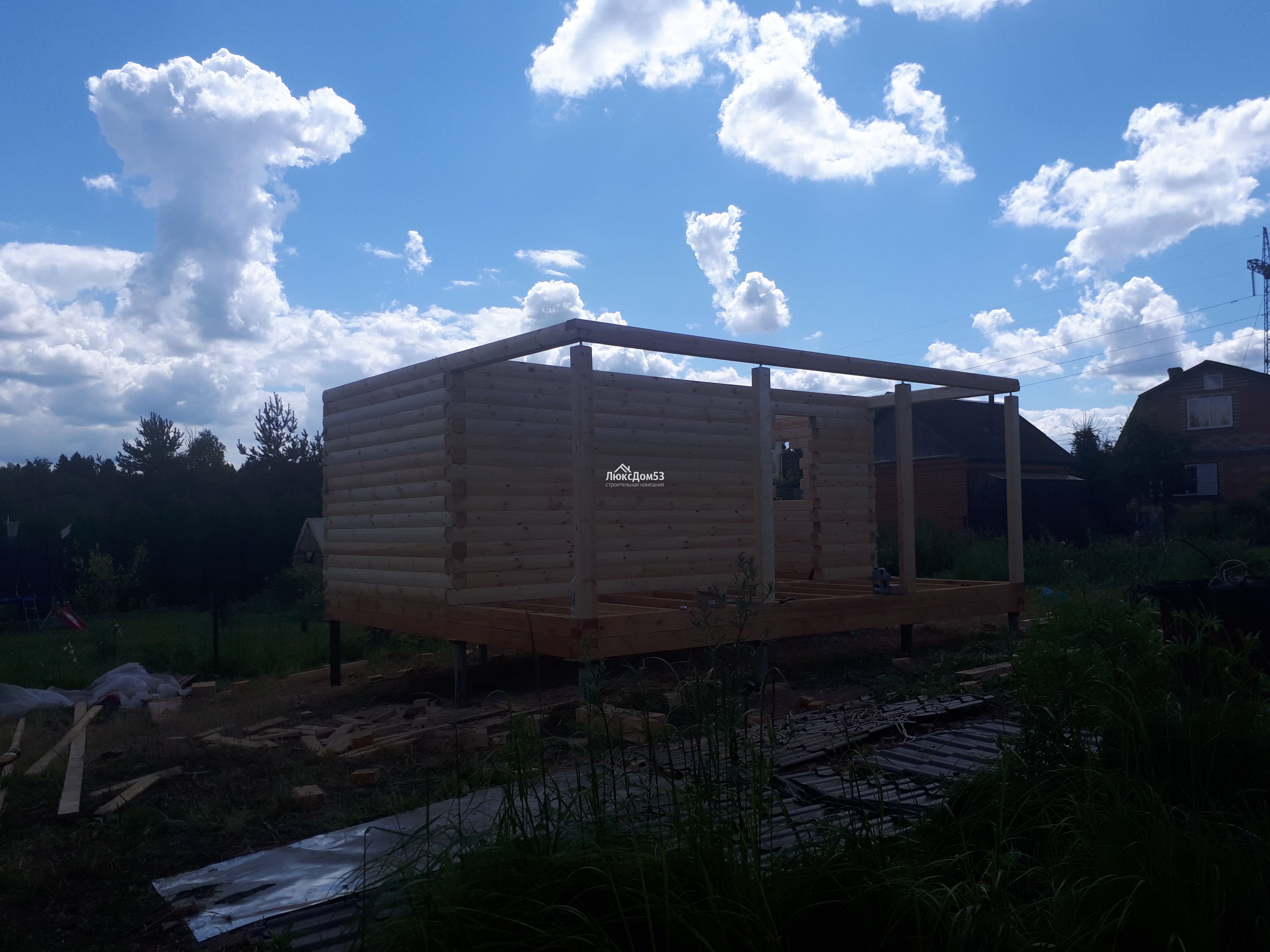 Опорные строганные столбы 100х150мм устанавливаются с компенсаторами усадки.Оконные и дверные проемы сруба делаются чуть выше столярных изделий. Усадочный зазор заполняется мягким утеплителем и закрывается наличником.