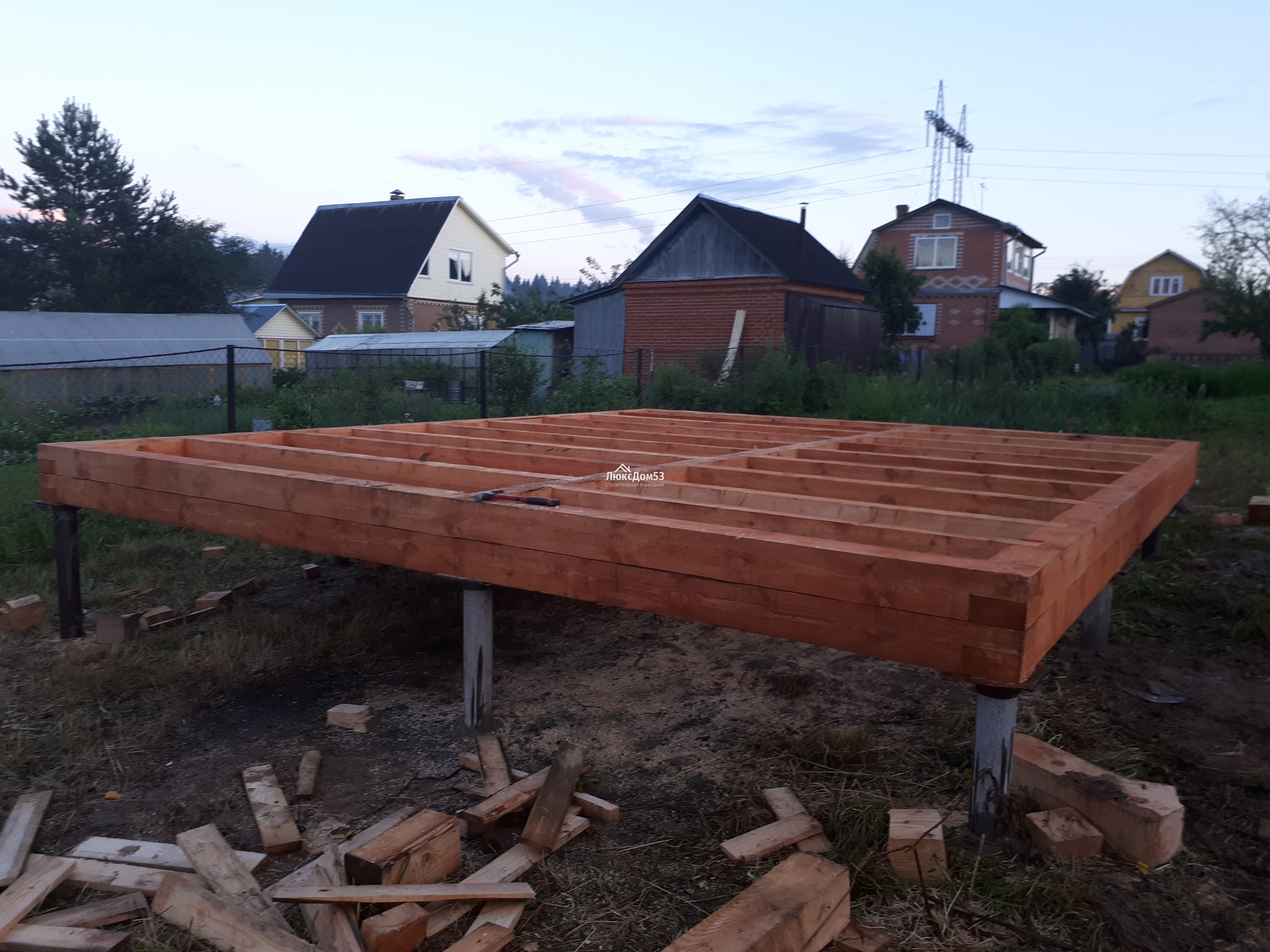 Брус не строганный сечение 100х150мм/150х150мм/200х200мм (1 сорт). В два ряда, для жёсткости лаг. На террасе второй ряд из доски 50х150/200мм