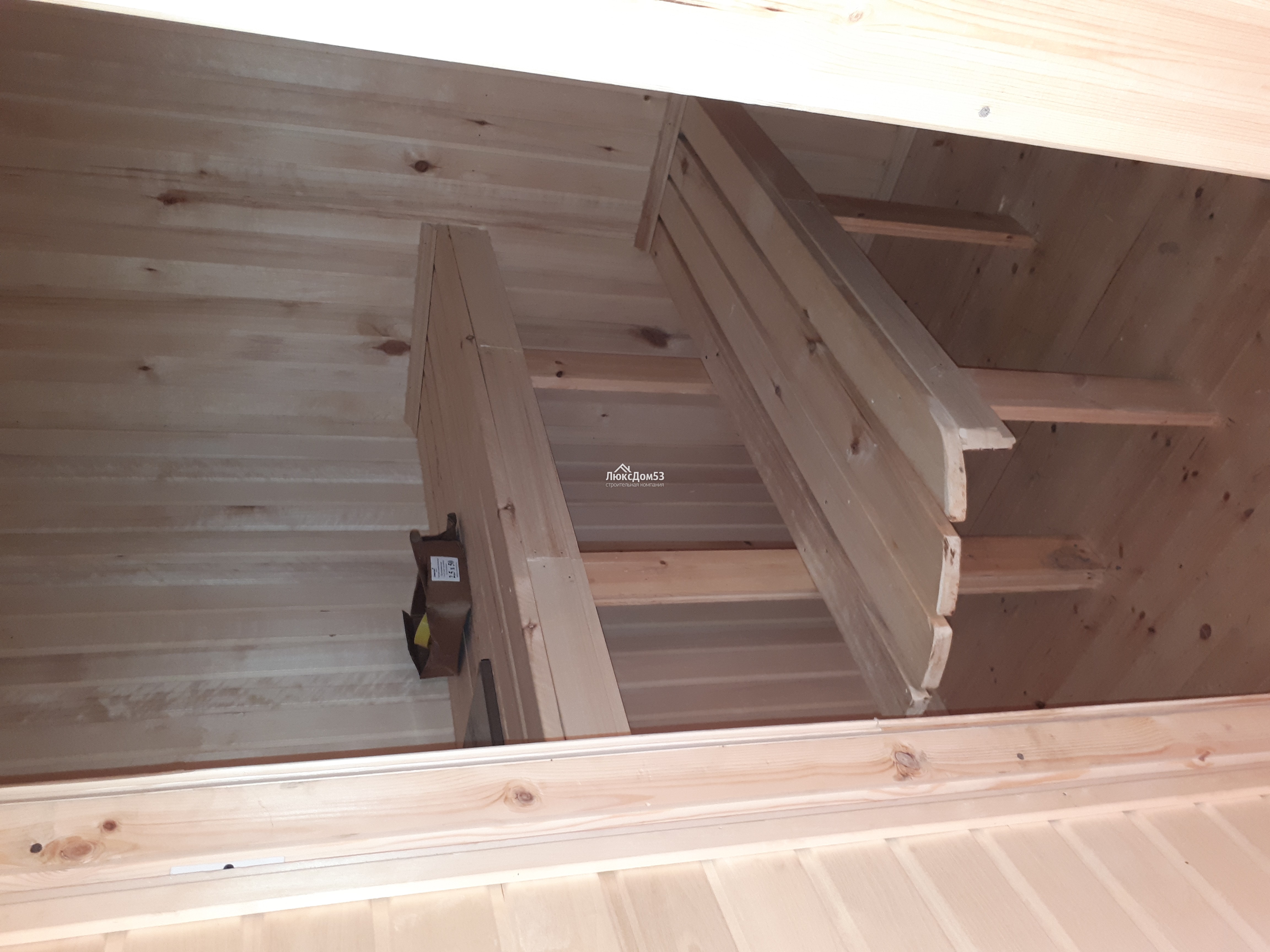 Стены и потолок обшиваются осиновой вагонкой класса "А" с прокладкой высокотемпературной отражающей изоляции (фольги). Пологи класс А двухъярусные из строганной осиновой доски 27×90мм.