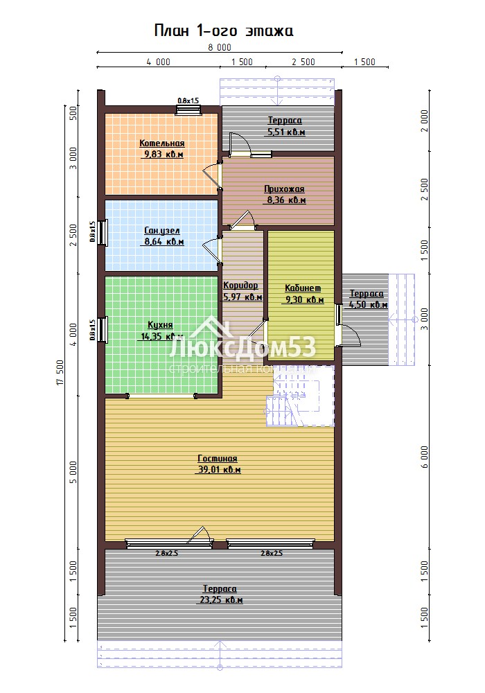 С перилами столбами и точеными балясинами. Ступени на лестнице из строганной доски 40×200мм. Тетива из строганного бруса 100х150мм.