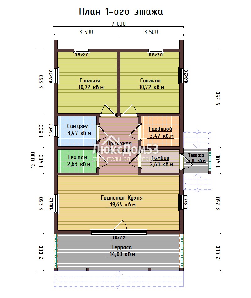 Брус не строганный сечение 100х150мм/150х150мм/200х200мм+50х150мм/50х200мм в зависимости от выбора толщины стен. (1 сорт). В два ряда, для жёсткости лаг. На террасе второй ряд из доски 50х150мм/50х200мм. Монтаж защитной сетки от грызунов!!!