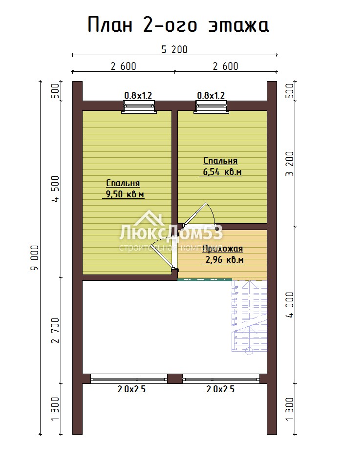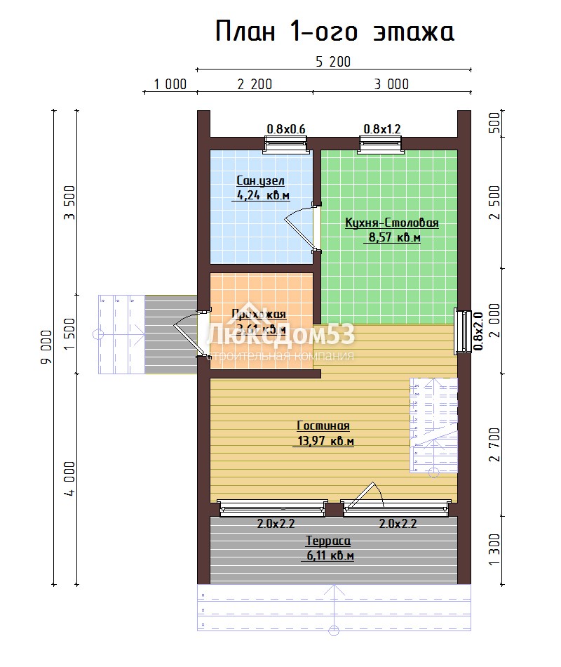 С перилами столбами и точеными балясинами. Ступени на лестнице из строганной доски 40×200мм. Тетива из строганного бруса 100х150мм. |