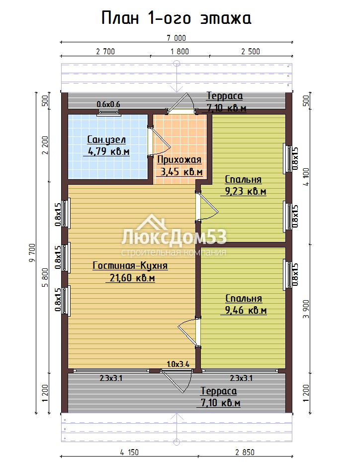 Брус не строганный сечение 100х150мм/150х150мм/200х200мм+50х150мм/50х200мм в зависимости от выбора толщины стен. (1 сорт). В два ряда, для жёсткости лаг. На террасе второй ряд из доски 50х150мм/50х200мм. Монтаж защитной сетки от грызунов!!!