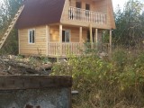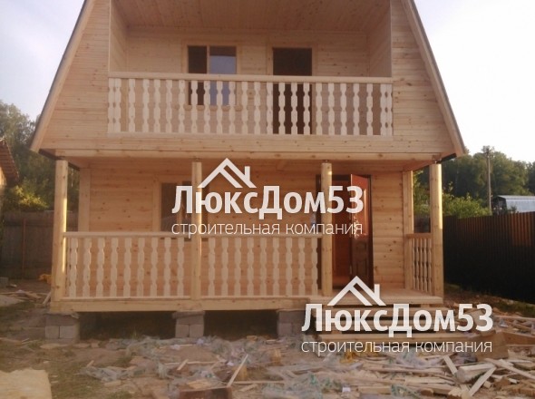 С перилами и точеными балясинами. Ступени на лестнице из строганной доски 40×200мм. Тетива из строганного бруса 100х150мм.