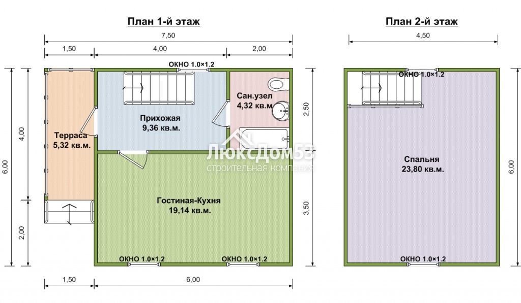 Деревянные, с двойным остеклением и обсадной коробкой. Стандартный размер окна 1.0×1.2м. с фурнитурой (возможен другой размер по желанию заказчика). Кол-во и размер по проекту.(В оконные проемы впиливаются ройки).