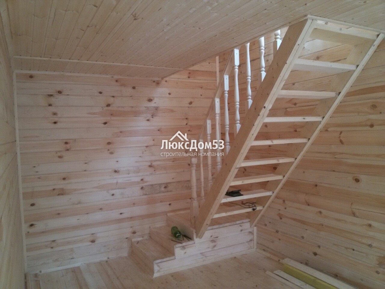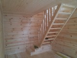 С перилами и точеными балясинами. Ступени на лестнице из строганной доски 40×200мм. Тетива из строганного бруса 100х150мм.
