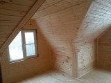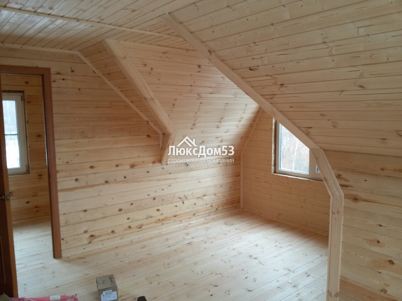 Вагонка Euro хвоя,сорт «В» принудительной сушки 12х90х6000мм: потолок первого этажа, стены и потолок полуторного этажа, каркасно-щитовые перегородки полуторного этажа.Плинтус и наличники Евро.