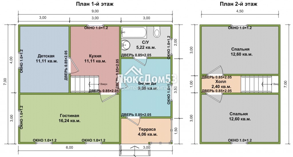 Деревянные, с двойным остеклением и обсадной коробкой. Стандартный размер окна 1.0×1.2м. с фурнитурой (возможен другой размер по желанию заказчика). Кол-во и размер по проекту.