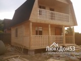 С перилами столбами и точеными балясинами. Ступени на лестнице из строганной доски 40×200мм. Тетива из строганного бруса 100х150мм.
