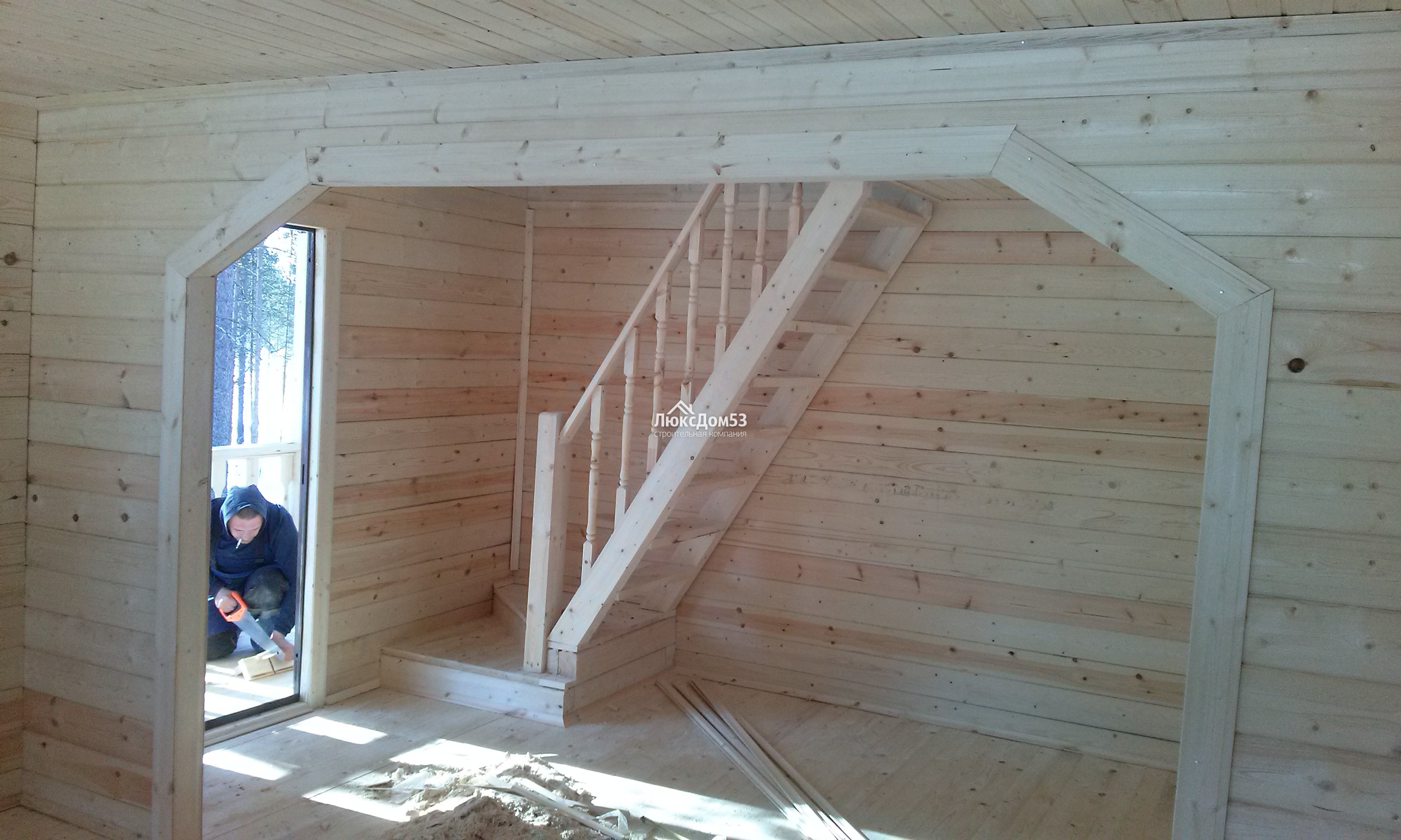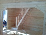 С перилами столбами и точеными балясинами. Ступени на лестнице из строганной доски 40×200мм. Тетива из строганного бруса 100х150мм.