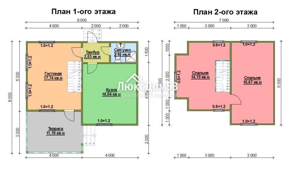 Деревянные, с двойным остеклением и обсадной коробкой. Стандартный размер окна 1.0×1.2м. с фурнитурой (возможен другой размер по желанию заказчика). Кол-во и размер по проекту.