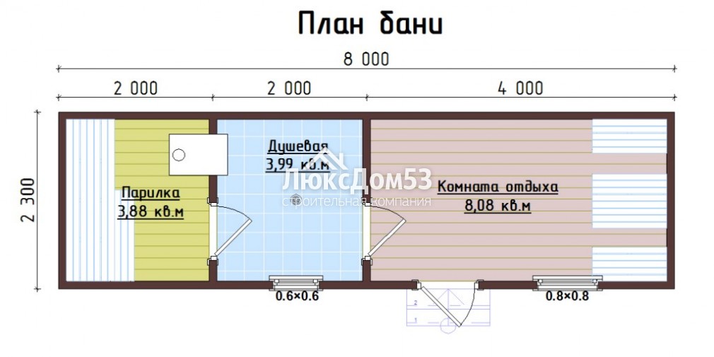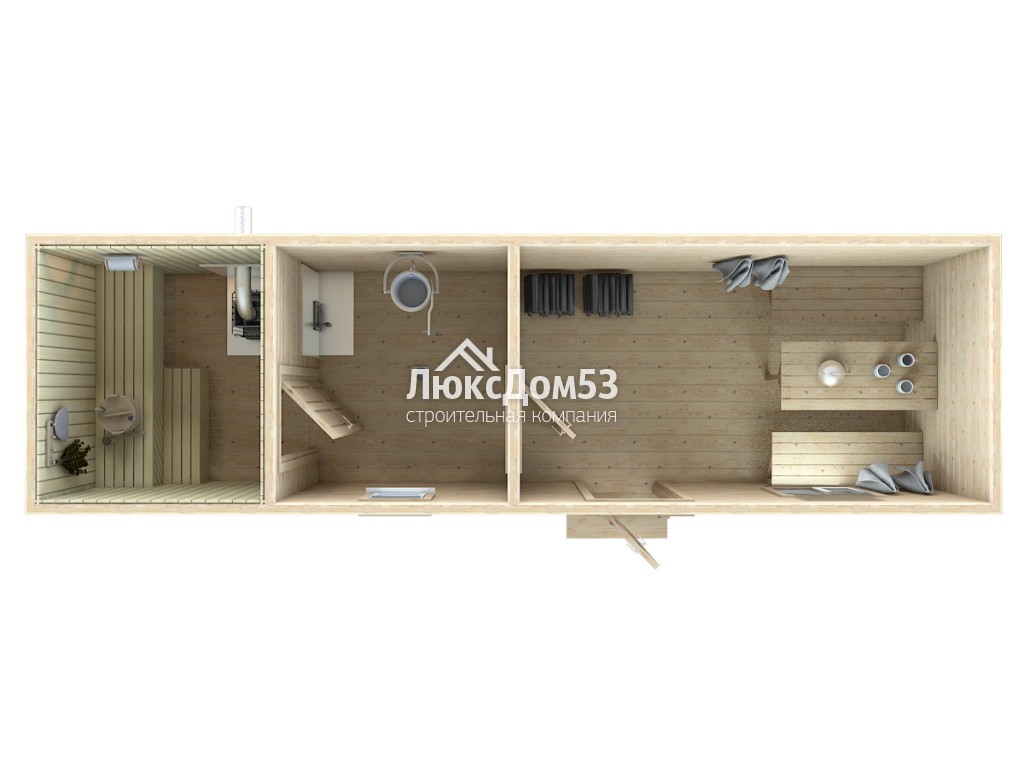 | Моечные отделение | Слив в центре пола, вывод трубы снизу бани,для стока воды | |||