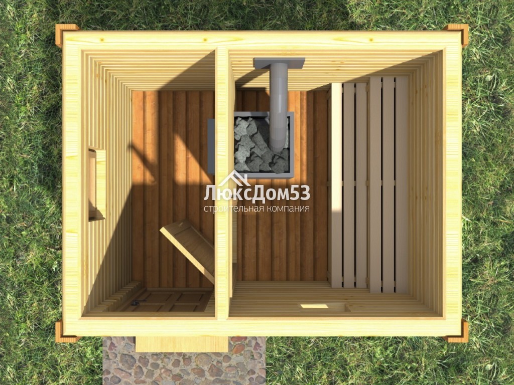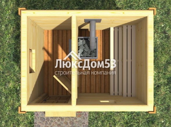 Стены и потолок обшиваются осиновой вагонкой класса "А" с прокладкой высокотемпературной отражающей изоляции (фольги). Пологи класс "А" двухъярусные из строганной осиновой доски 27×90мм.